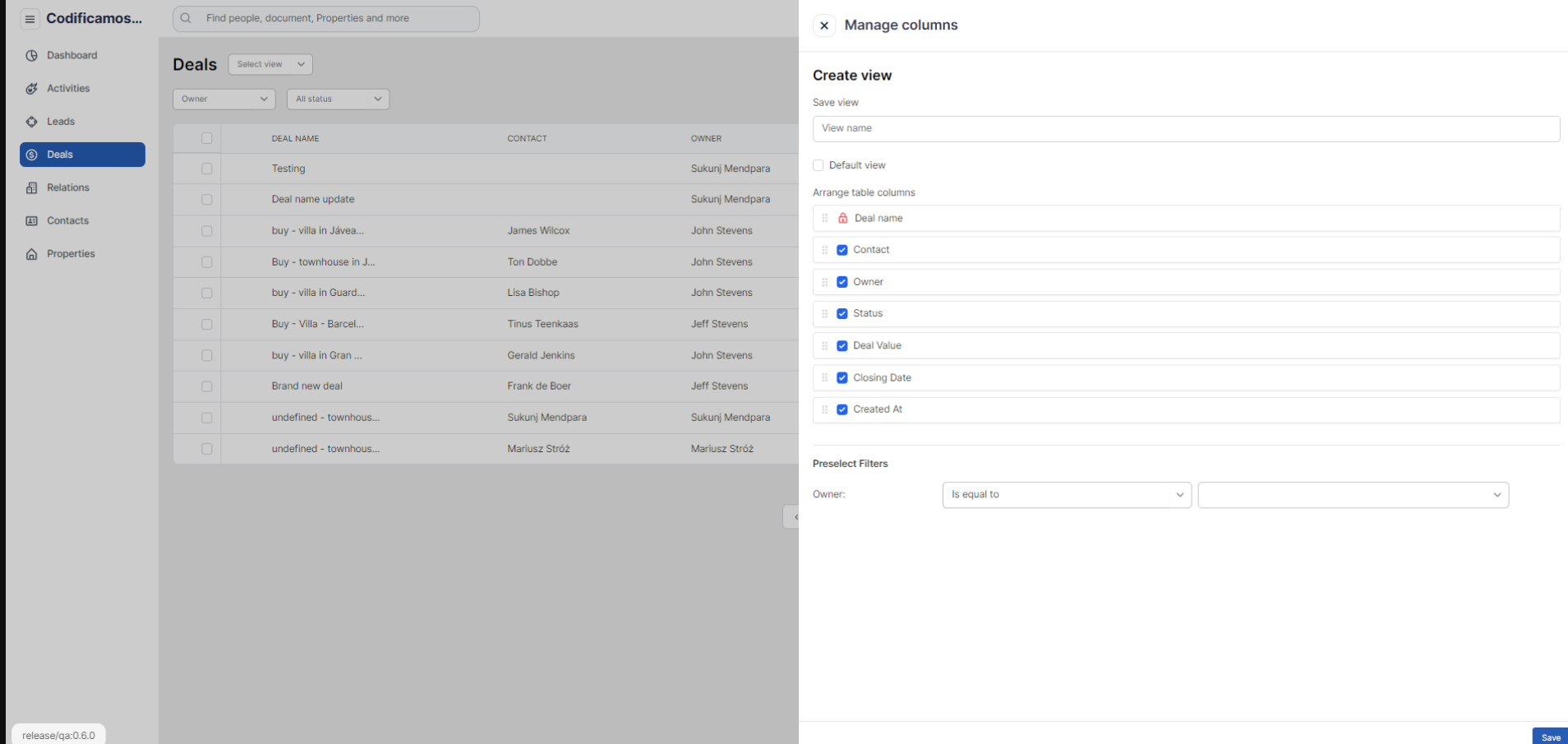 The deals interface allows the user to create any view based on the selected properties and also enables them to filter out the search results.