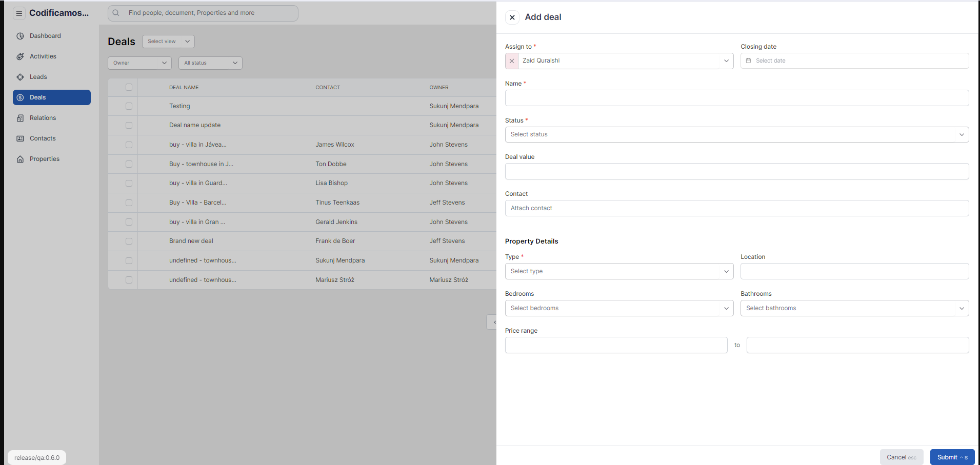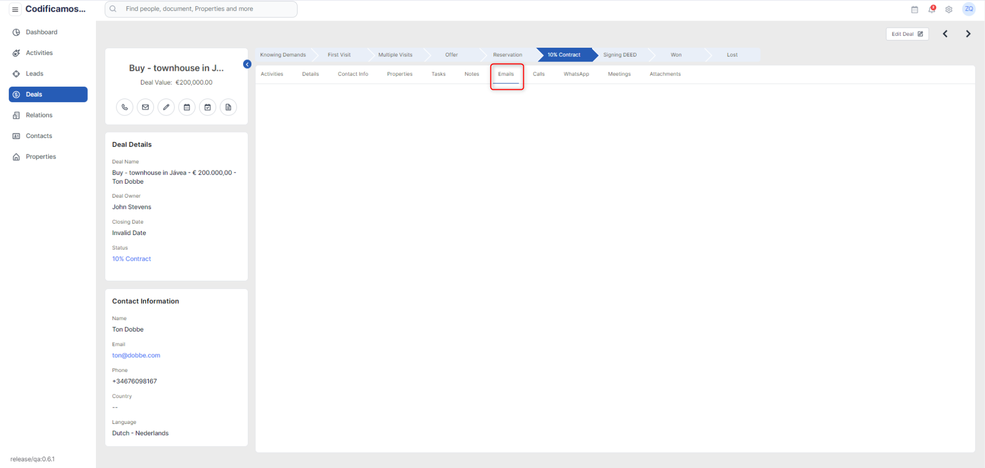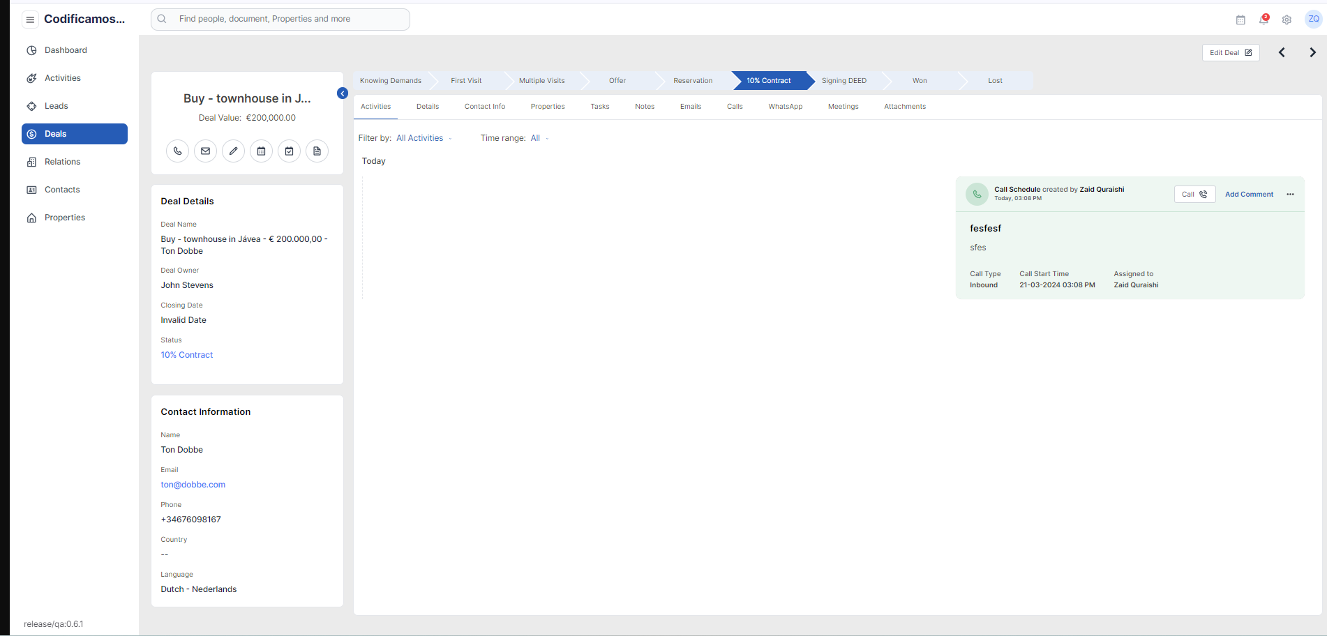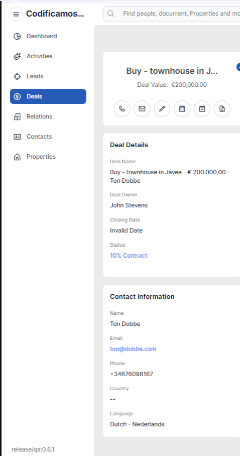 Once the user clicks on any particular deal, the user should be able to navigate to the deal details page where all the deal information will be shown to the user including the following tabs and should be able to edit the deal details as well: