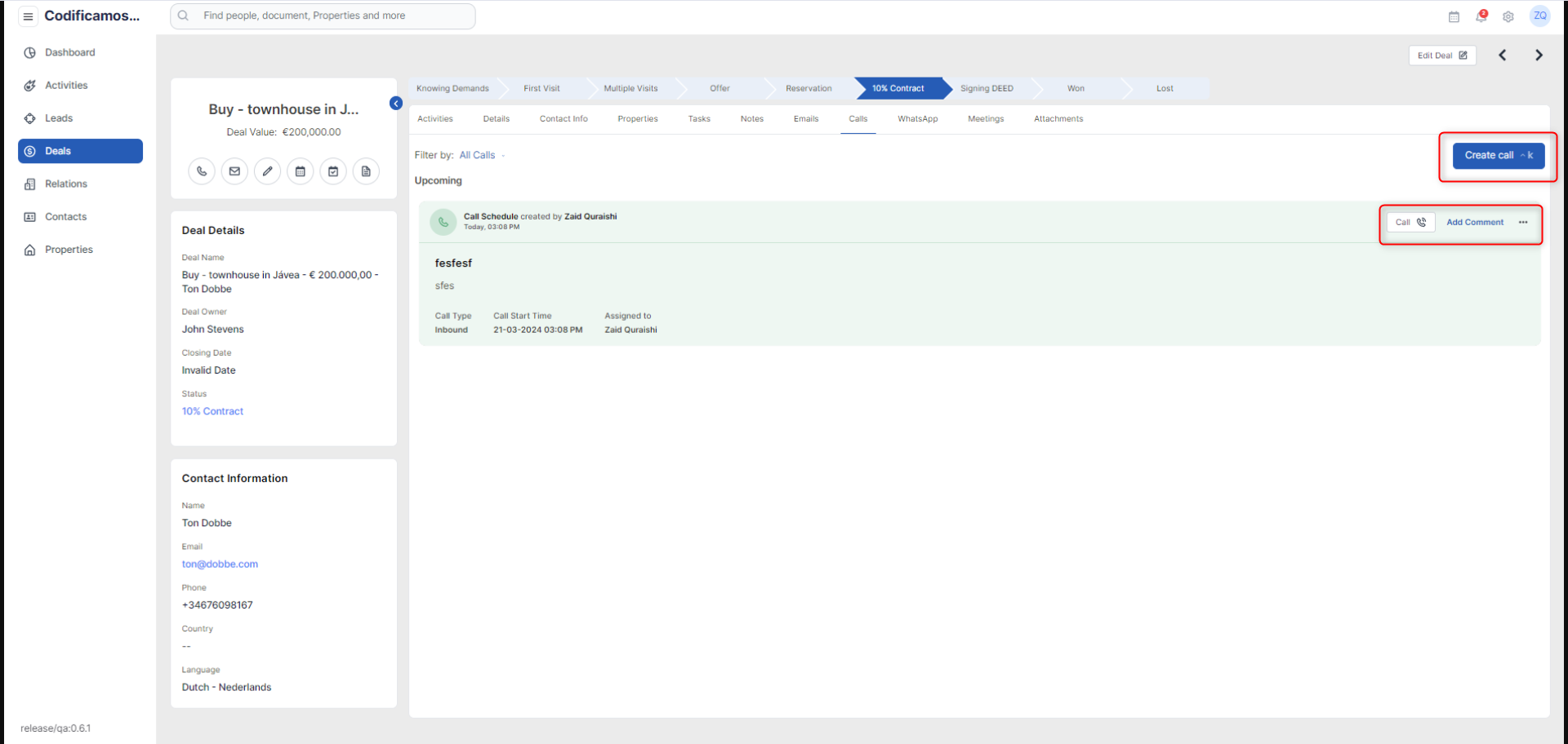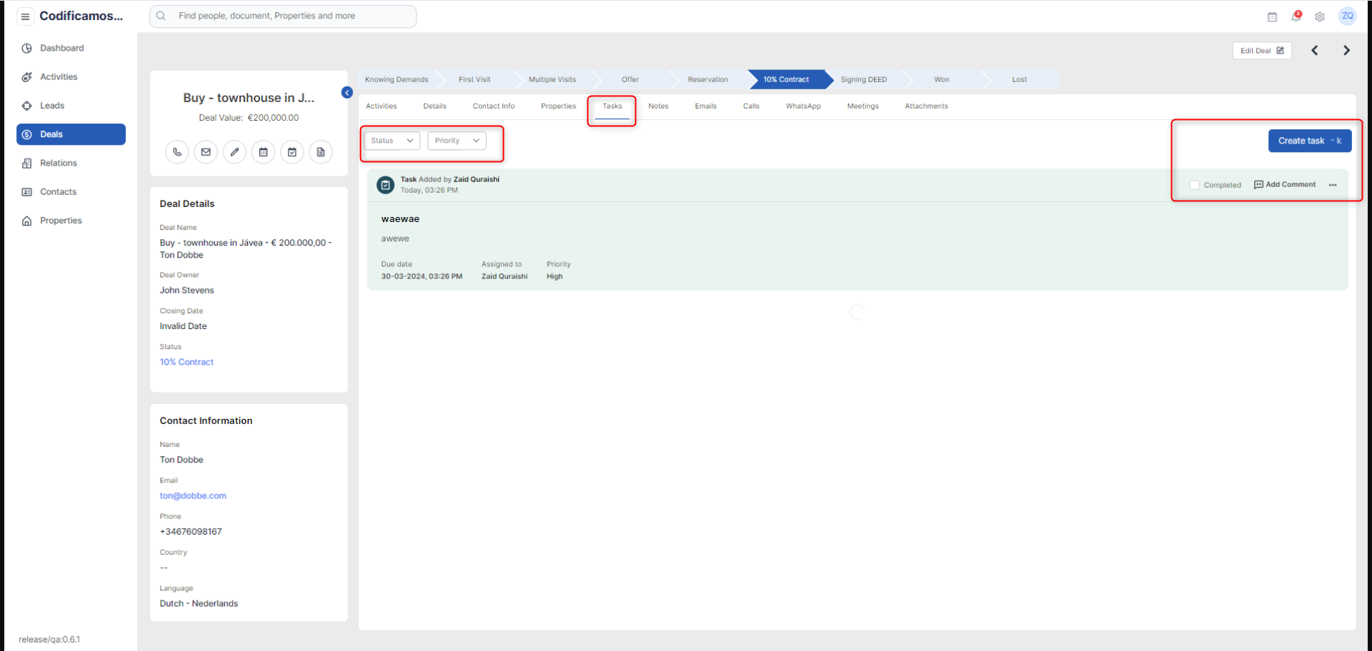 The user is allowed to create a task for the deal and preview the list of tasks already created in the system. The user can also mark the task as completed, add a comment and filter out the tasks by status and priority.