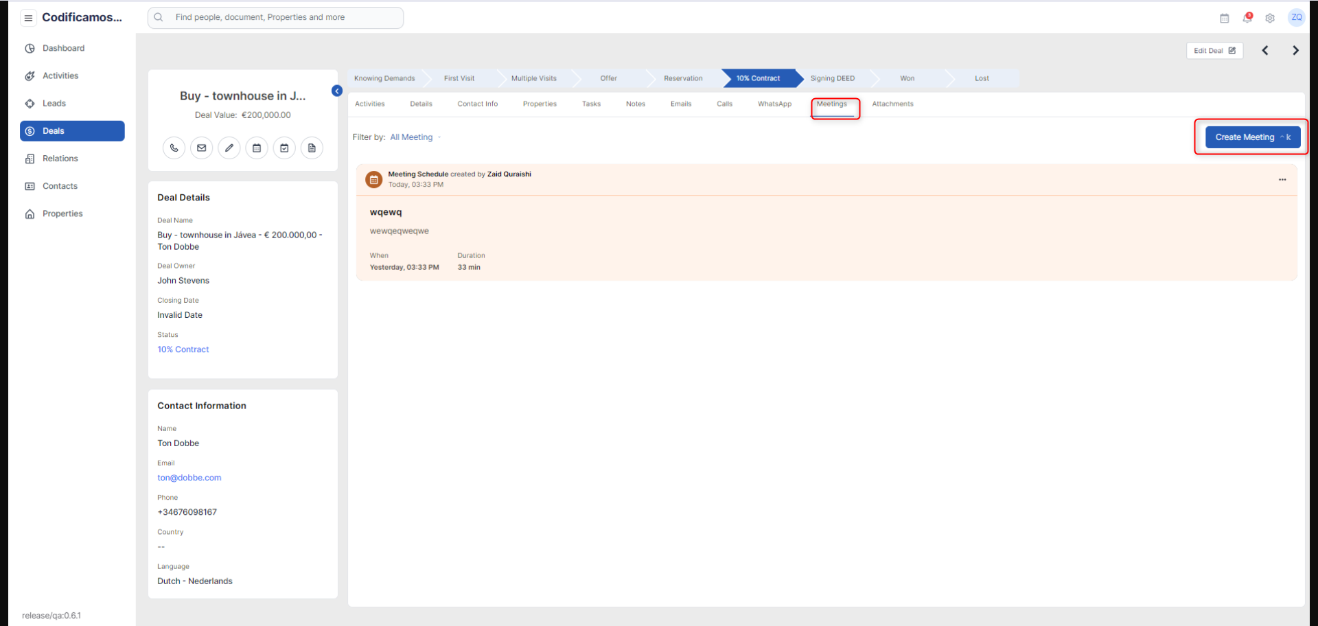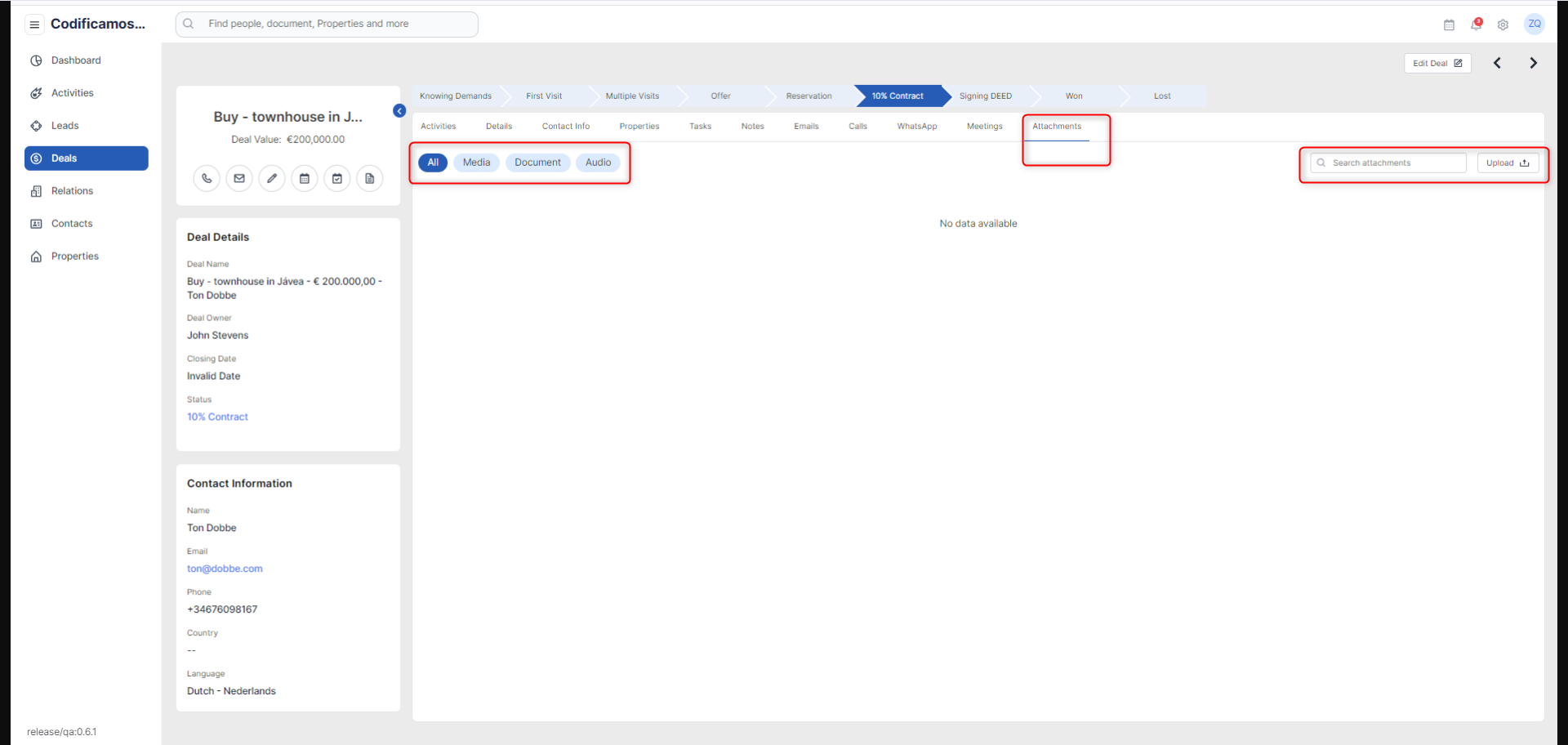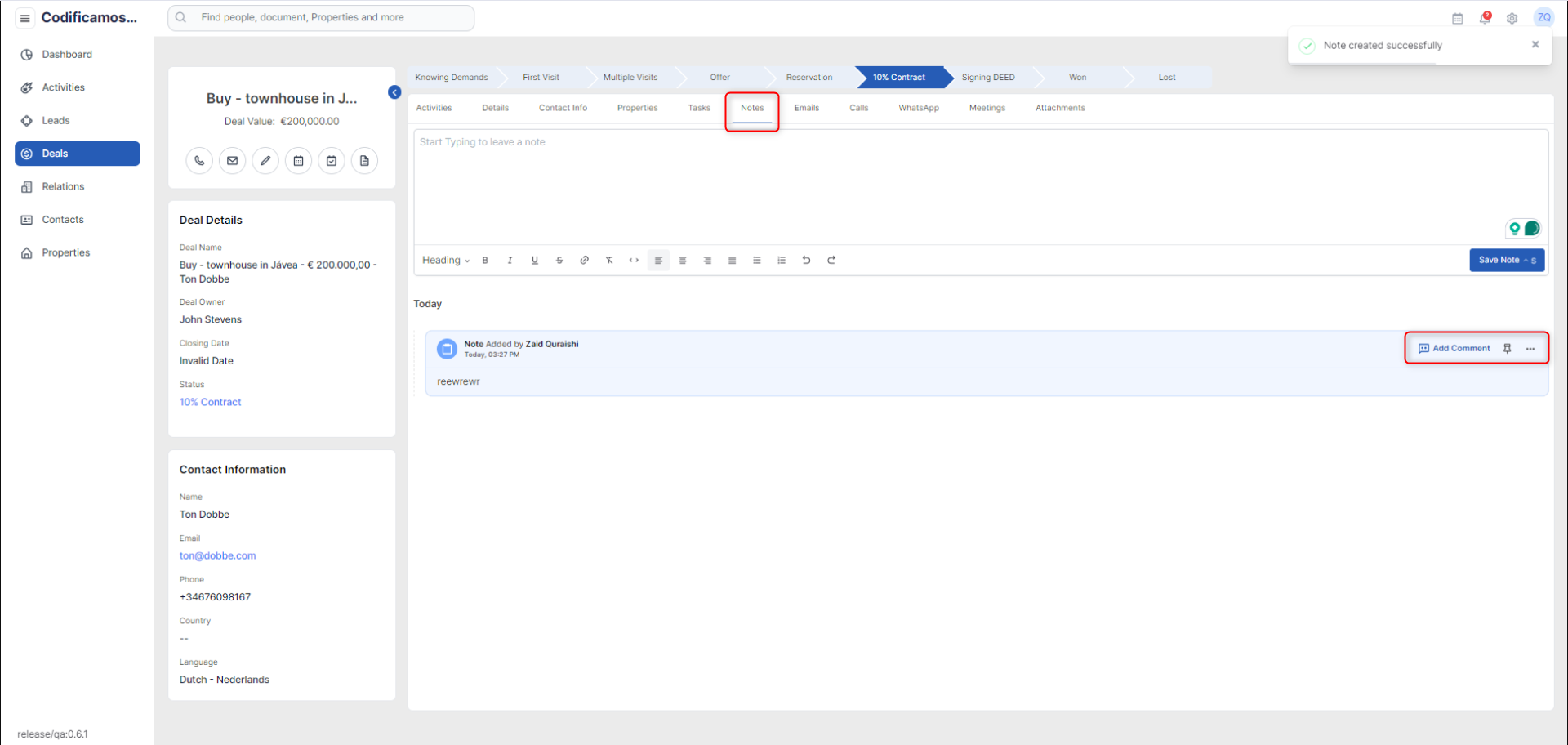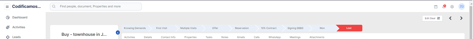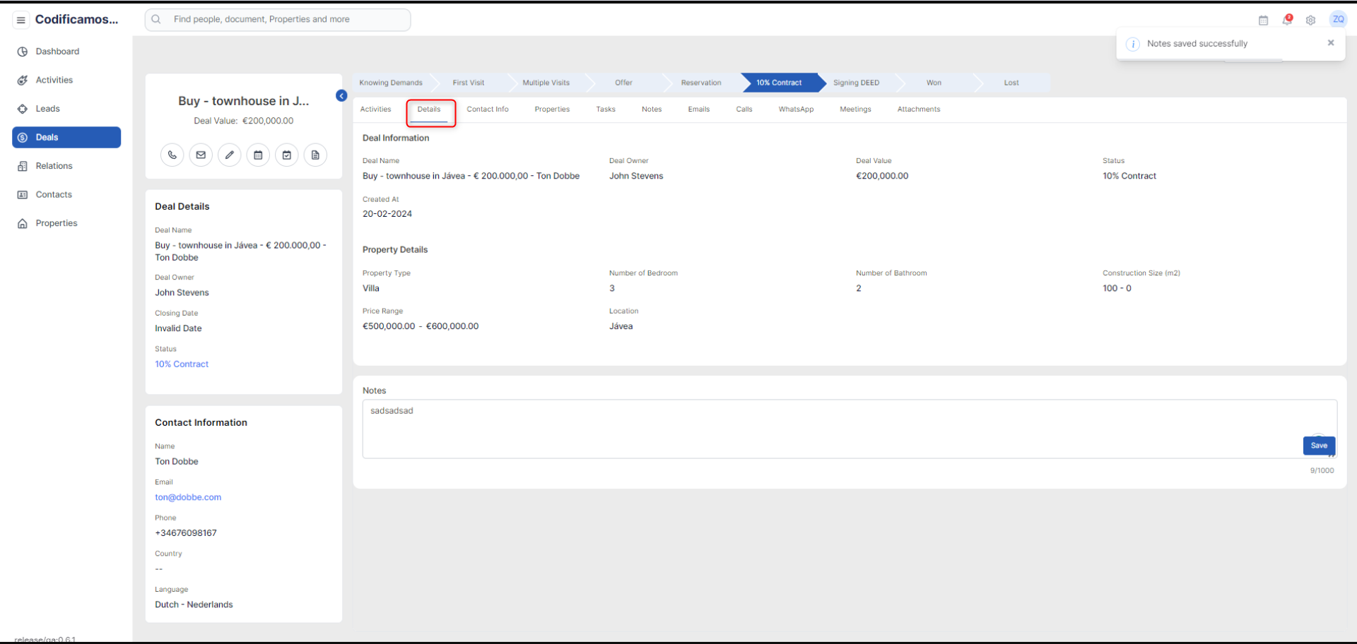 The details tab will provide the user with all the information associated with a deal i.e deal information and property details along with an option to add and save notes for the deal.