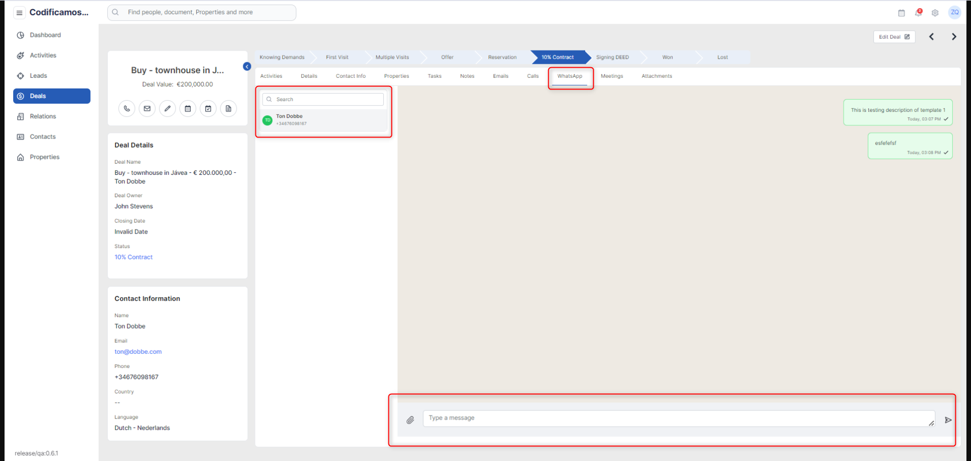 The user will be able to send a WhatsApp message to the contact associated with the deal directly and preview the WhatsApp chat history for multiple contacts.