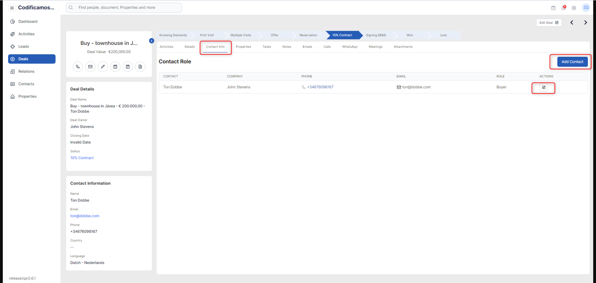 The contact info tab will show the user list of contacts and their role that are associated with the particular deal. The user can also create a new contact and configure its role.