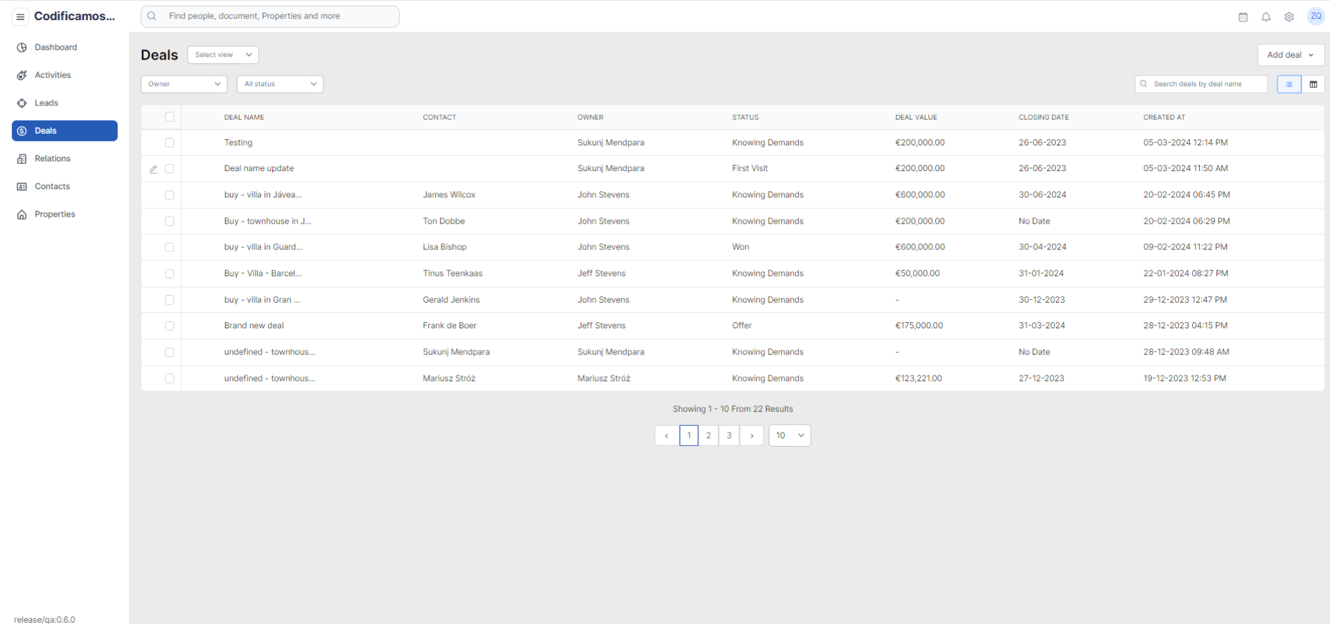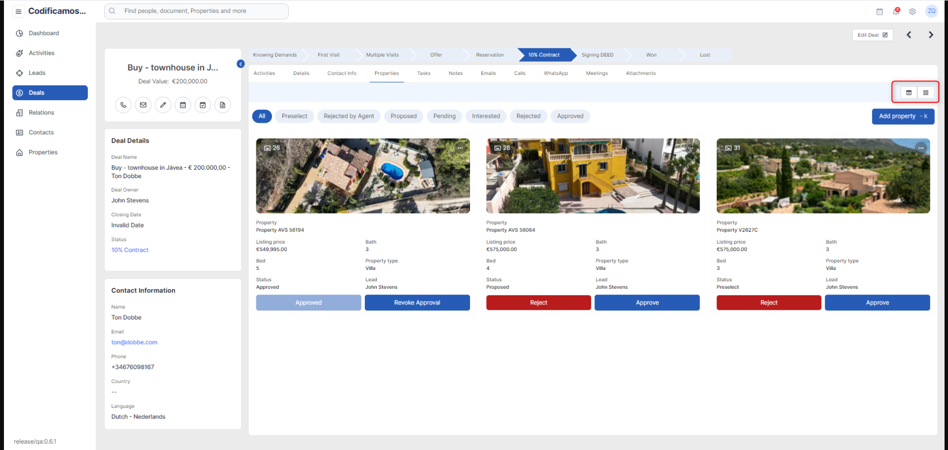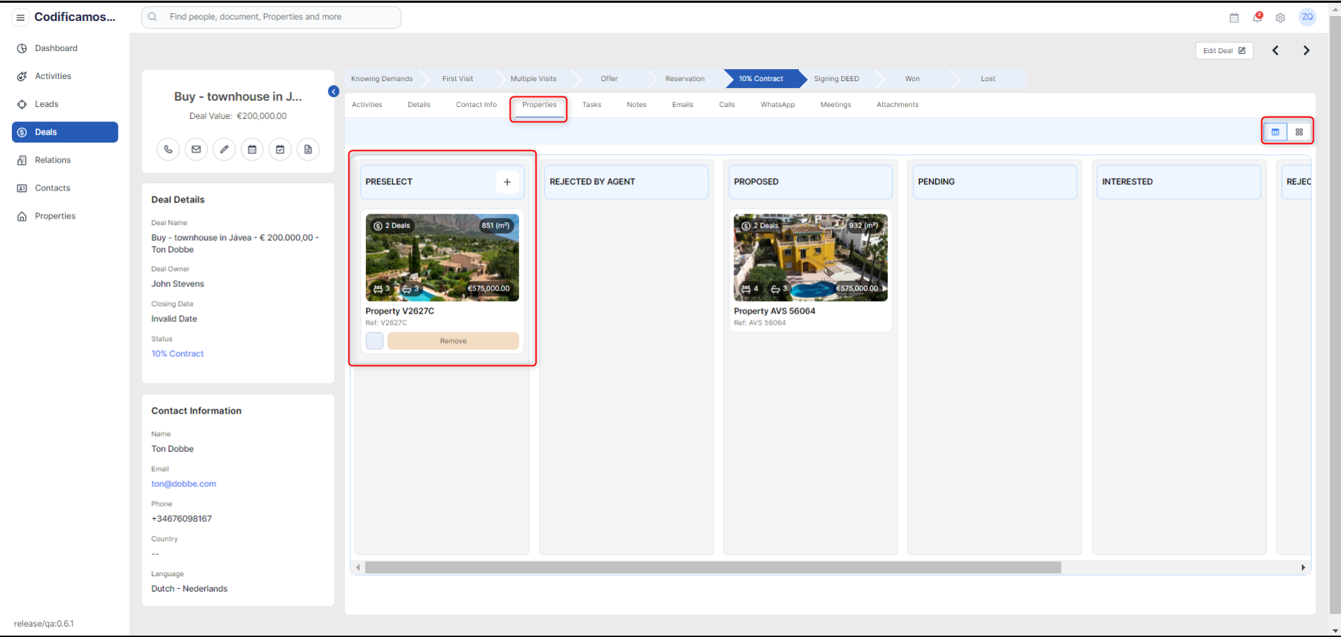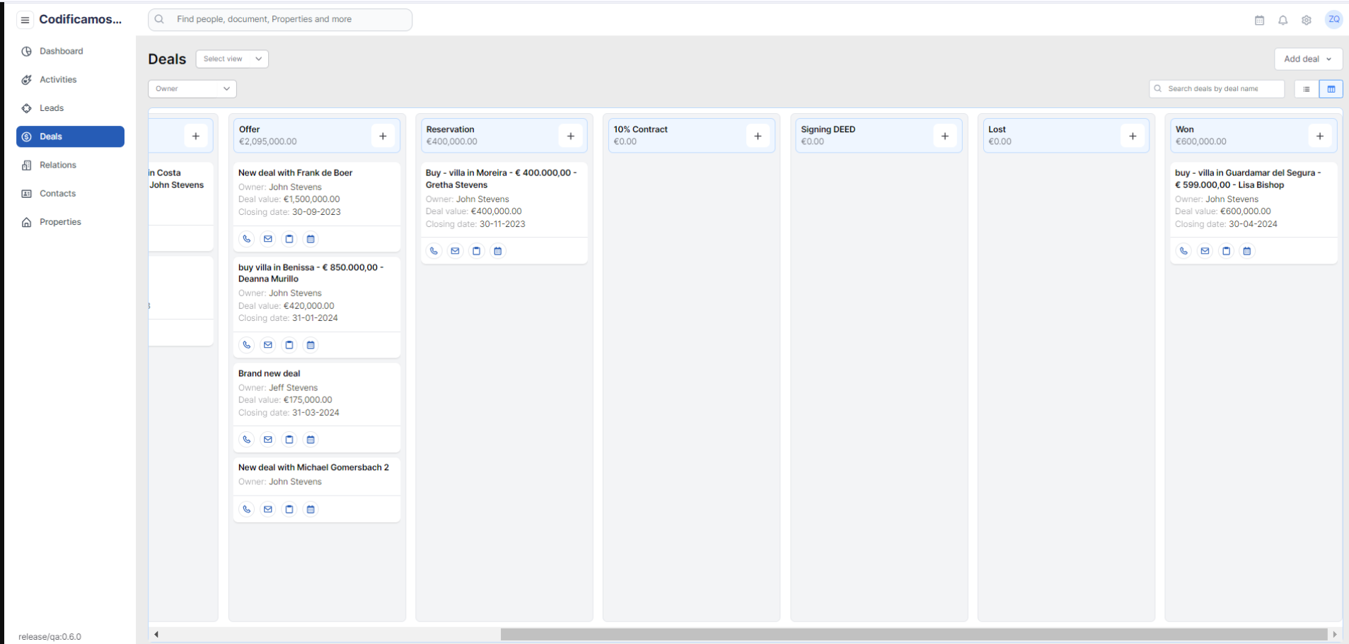 The user will be able to switch to the Kanban view where all the deals will be listed in their associated status: